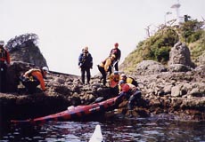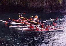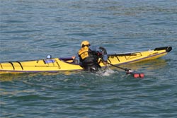 ひっくり返った時、沈脱せずにカヤックを起こすエスキモーロールを学びます。ロールができるようになると、他のテクニックも更に上達することでしょう。また、すでにロールのできる方は、他の種類のロールを学ぶことができます。海上では、ロールで上がらなかった時には沈脱することになりますが、その状況に応じて速やかに海上で確実にカヤックに乗り込まなくてはなりません。仲間の沈脱や自分自身が沈脱した時のセルフレスキュー、グループレスキューをマスターします。また、カウテールやトゥライン、プーリーを使用してのレスキューベルトでのカヤック牽引を体験します。便利さと同時に危険性や限界も感じてください。ツアーリーダーには必須項目です。AM10:00開始昼食PM3:30頃終了