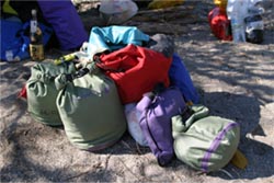 • カヤックの中にはハッチが小さい物がある。物理的に入らない物はあきらめるしかないが、衣類や寝袋など大きさがどのようにでも変化できる物なら防水バックをカヤックの中に入れ、そこへ寝袋などをしまい込み最後にバックをロックする。この場合だとエア抜きが思うように出来ないので収納率は下がる。