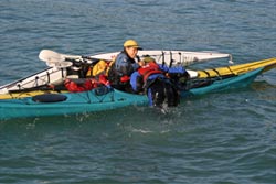 • デッキ上の荷物も出来るだけ少なく小さくまとめる事を心がける。綺麗にまとまったカヤックは安定性と見栄えも良い。デッキ上は100%の確率で濡れる。風や沈で紛失するケースもある。通常デッキ上に出される装備はチャートケース、コンパス、パドルリーシュ、ヘルメット、スペアパドル、ビルジポンプ、パドルフロート等だ。デッキバックがあれば、防水タイプのカメラや行動食、サングラスなどの頻繁に使うものを収納するのに便利だ。水筒は直射日光が強ければ暖まってしまうので注意が必要だ。バウ側のデッキに関しては常に視界中にあるので紛失しても気がつくのが早いが、リアデッキに関しては後ろを見ない限り気がつかないので注意が必要である。それでもデッキ上に荷物を積まなければならないときは低重心で防水バックに収納し、しっかりと固定する。重心が高いと不安定になり沈しやすく、また沈後のカヤックを起こすのにも一苦労する。