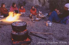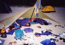 • 自分がこれからどこを漕ぐのかによって食材や水の量は決まってくる。そこは人もいなく補給できないところか?毎日でも補給できるところか?スタックした場合でも陸上から補給できるか?川の水は煮沸すれば飲めるのか?魚が沢山釣れるのか?等々、自然相手のカヤッキングだけに「絶対」がないので非常用は必ず携帯すること。食料や水に関しては事前のナビゲーション作業に大きく関係する。他に夏場のナマ物は傷みやすいので注意。使う寸前に購入した方が無難である。水に関してはペットボトルなどを使用すれば軽量で安上がりだ。大量の水を持つ場合はビニール性のタンクも重宝する。(カヤック内で形が変わるのでどうにでもなる)